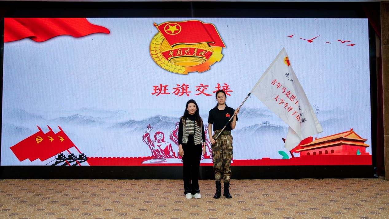 开班仪式现场,“青马工程”大学生骨干培训班第十九期学员代表向第二十期学员代表交接班旗。旗帜的交接象征着理想信念的闪耀与传承,点燃了学员们的热情与信心。