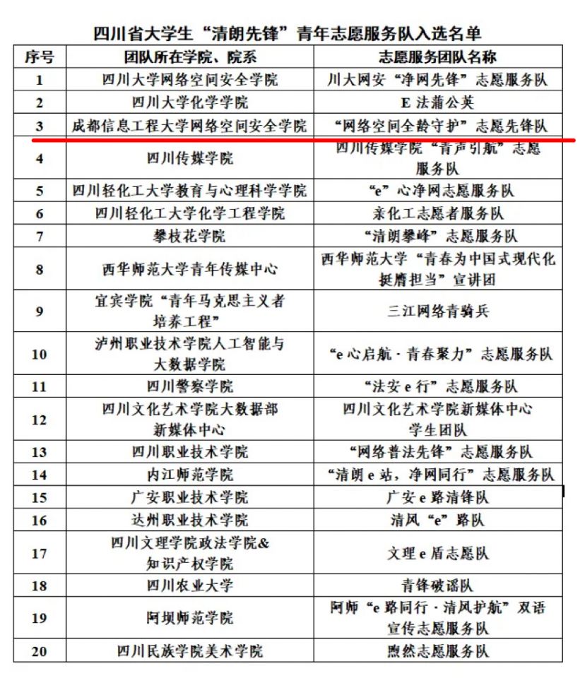 为深入学习贯彻习近平法治思想和习近平总书记关于网络强国的重要思想,深入宣传解读互联网法律法规,普及网络举报辟谣知识,提升青年学生对网络有害信息的辨识能力,中共四川省委网信办与共青团四川省委联合组织开展2025年在川高校大学生“e路同行 清风护航”青春志愿专项行动。此次行动面向全省高校选拔招募20支四川省大学生“清朗先锋”青年志愿服务队。我校“网络空间全龄守护”志愿先锋队脱颖而出,成功入选。