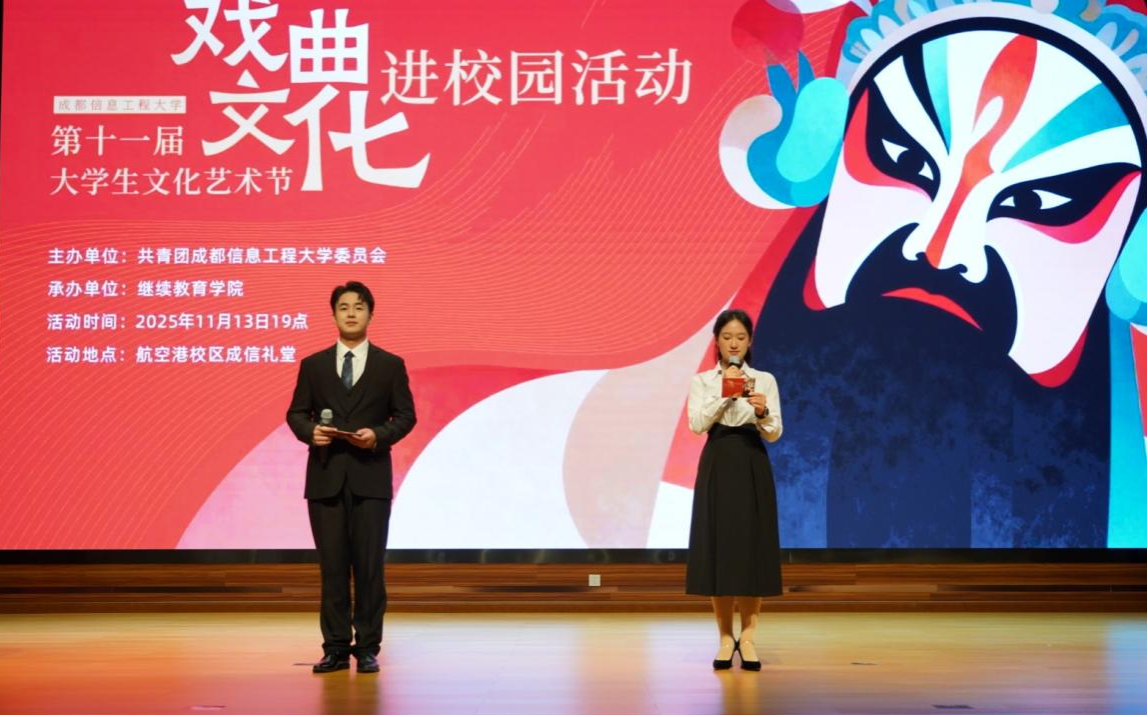 11月13日,由校团委主办、继续教育学院承办的成都信息工程大学第十一届大学生文化艺术节“戏曲文化进校园”活动在航空港校区成信礼堂举行。校团委负责人、航空港校区各学院分团委书记及500余名师生代表共同观看了演出。