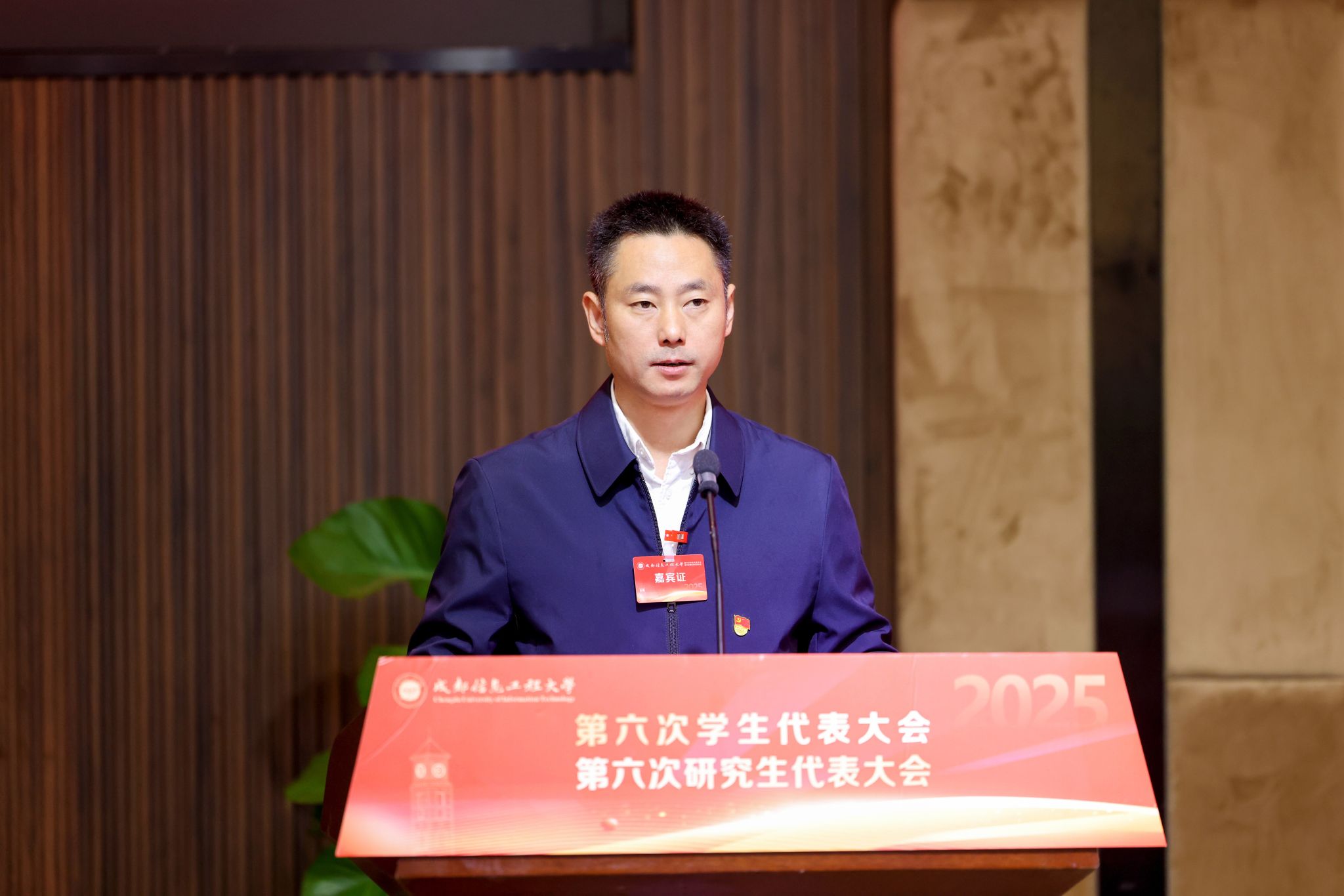 陈权亮代表学校党委向大会的召开表示热烈祝贺,向长期以来关心支持我校学生会、研究生会工作的团省市委、省市学联、兄弟院校表示衷心感谢,向全校青年学生致以亲切的问候。他表示,校学生会、校研究生会在学校党委的坚强领导和学校团委的具体指导下,紧扣立德树人中心工作,在思想政治引领、服务成长成才、繁荣校园文化、维护学生权益等方面取得了积极成效。他强调,新时代新征程为广大青年学生增长才干、建功立业提供了广阔舞台。他寄语全校青年学生:一是高举思想旗帜、筑牢信仰之基,做胸怀“国之大者”的追梦人;二是勇担时代重任、提升服务效能,做投身强国伟业的实干家;三是锐意深化改革、永葆清新本色,做全面从严治会的践行者。他希望成信青年珍惜时代机遇,勇担历史使命,在实现中华民族伟大复兴的宏伟征程中奋力书写绚丽的青春华章,在加快推进教育强国建设、助力学校高质量发展的生动实践中贡献磅礴的青春智慧和力量!