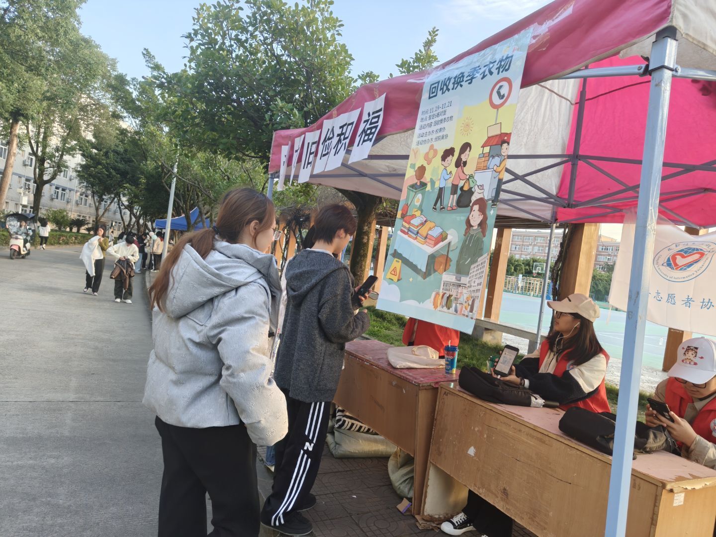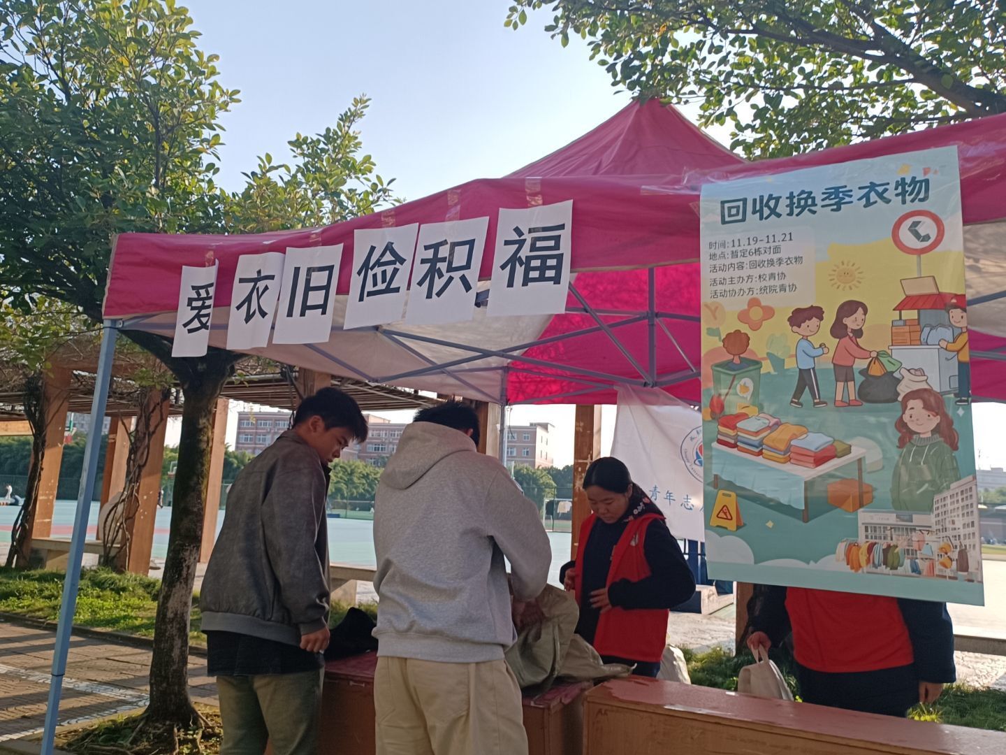 2025年11月19日至21日,由成都信息工程大学青年志愿者协会主办、统计学院青年志愿者协会协办的“爱衣旧,俭积福”旧衣回收活动,在龙泉校区持续开展。活动过程中同学们纷纷带着整理好的闲置衣物、布娃娃前来捐赠,现场爱心氛围浓厚。